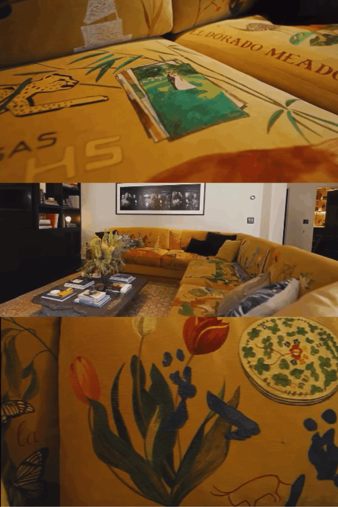 Connect with local or heritage craftspeople like embroiderers, painters, and leatherworkers. Think Bode and Green River Project’s mustard yellow sofa for Kendall Jenner, embroidered with hand-drawn illustrations of deeply personal motifs to the star, or the embroidered ottomans in this LA home of Studio MUKA founders.